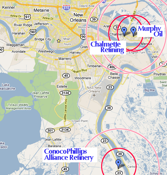Correction 02/28/2011: A map originally published with this article showed ConocoPhillips Alliance refinery erroneously . The map has been updated.