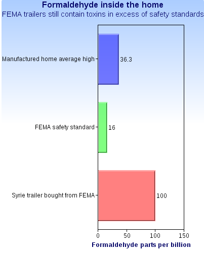 An air quality test done last month in a FEMA trailer housing Hurricane Katrina victims in Mississippi showed levels of the carcinogen that exceeded levels deemed safe by the federal government. The test, done by University of Oxford researcher Nick Shapiro, indicated a level of exposure of 105.6 parts per billion within the trailer, which was sold by FEMA in 2008 to a retired Mississippi couple who had lost their home to Katrina and could not afford to rebuild.
