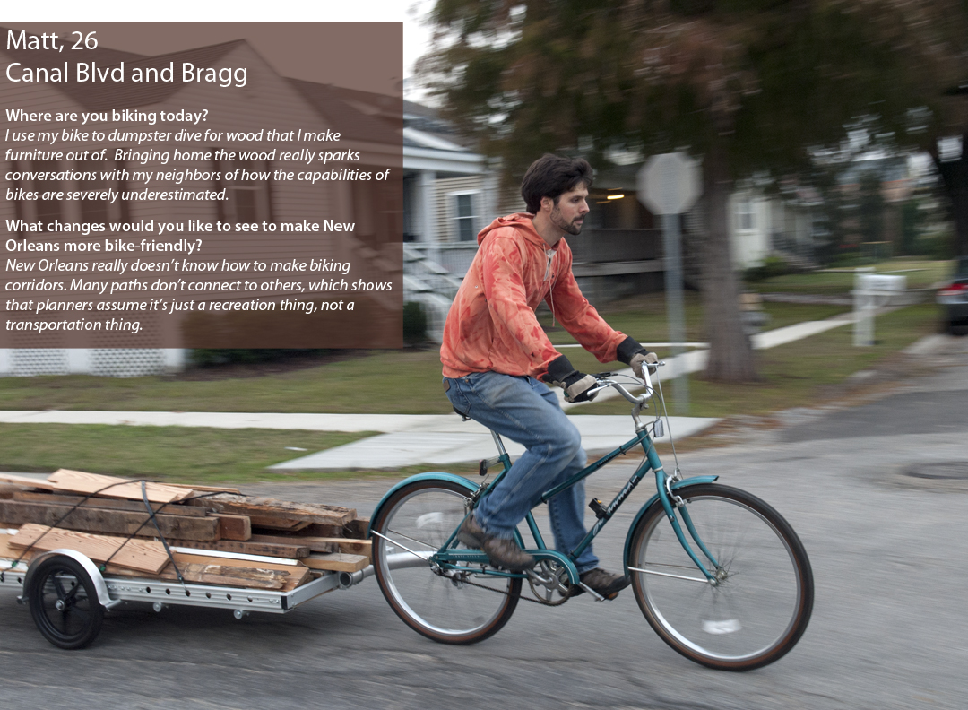 The following photo essay is a look at the cyclists who stand to benefit from the new policy. They were photographed at intersections identified by the Regional Planning Commission as crash “hot spots” because of the frequency with which accidents occur there. Several of the cyclists featured were found through Insight New Orleans. Insight New Orleans is a part of American Public Media’s Public Insight Network, an engagement platform for people to share with journalists their knowledge and insights about timely issues. (Photo Essay by Andy Cook)
