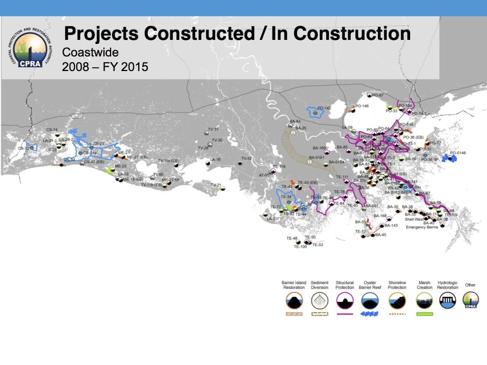 Since 2008, the coastal authority has spent or committed about $2 billion on 76 coastal restoration projects. The agency has put out another $11 billion on 36 structural projects. Most are for flood protection, including the state’s $8 billion share of New Orleans’ $14.5 billion storm surge protection system, which wasn’t part of the 2012 plan.