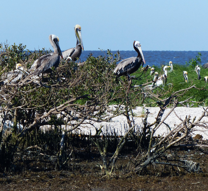 Proof of the comeback could be seen each spring in the string of marsh and mangrove islands scattered across the eastern reaches of Barataria Bay, including those called the Cat Islands. The pelicans would build their nests above tidal flows in the branches or crowns of the mangrove stands. By late April parents were guarding youngsters. Other species joined them, including roseate spoonbills and herons.