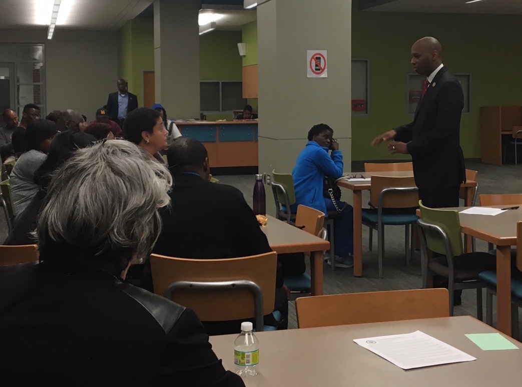Wednesday night, Lewis spoke to parents gathered in the gymnasium of Mary McLeod Bethune Elementary School of Literature and Technology. He introduced them to the “ExCEED team.”